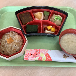 お祝い膳は、普通の食事と同様に入所者の皆さまが食べやすい形態に工夫して、お出ししました。皆さまから「おいしい」と喜んでいただきました。